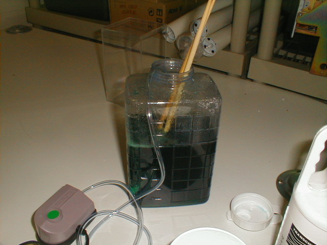 The plastic etching tank. $4.50 aquarium air pump at the bottom left.
