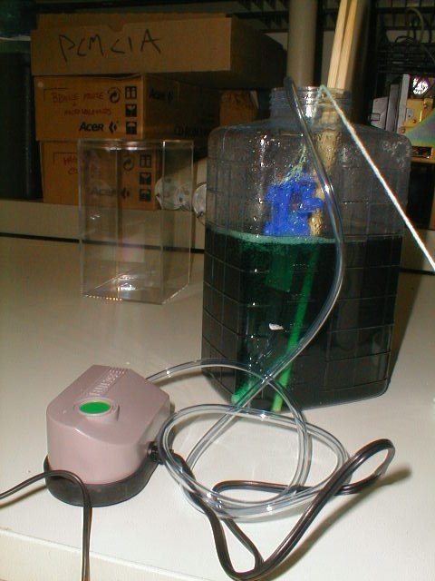 Etching in action. The board is being held with a plastic clip and suspended from a string.